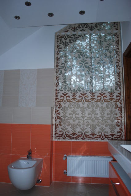 Если площадь ванной комнаты позволяет, то при помощи штор в помещении можно создать очаровательную атмосферу. В таком случае для штор следует выбрать влагостойкий материал. В ванной комнате, как и в других помещениях, шторы можно комбинировать с жалюзи.